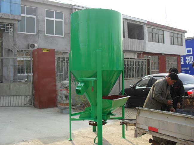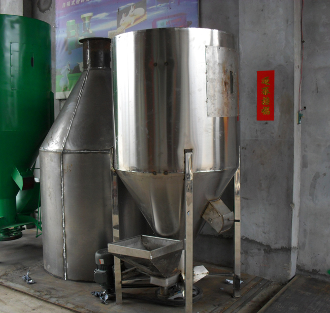 操作:由飼料攪拌機下方進料口加入需要混合的物料,由飼料攪拌機內的提升螺旋將攪拌物料從立式攪拌機的進料斗進入立式螺旋輸送器,向上提升到達頂端后,再以傘狀飛拋,從混料筒四周下落,從套筒底部的缺口處重新進入立式螺旋輸送器,再次向上提升,如此循環(huán)攪拌混合直到混合均勻,打開出料口將物料卸出。