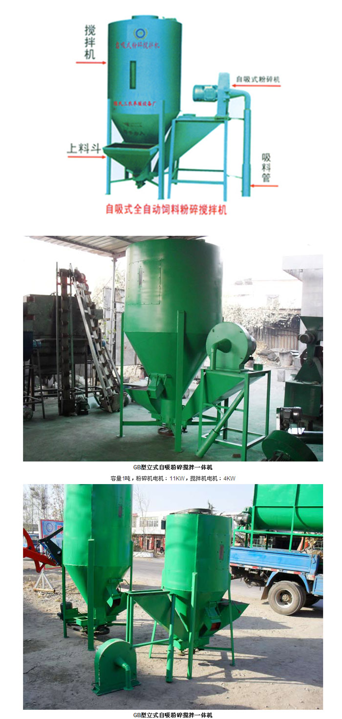 立式飼料攪拌粉碎機,這是專為農村飼養(yǎng)戶、小型飼養(yǎng)場、中小型配合飼料廠設計的小型飼料加工設備,集自吸提升粉碎機、混合攪拌一體機器。