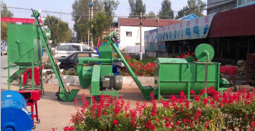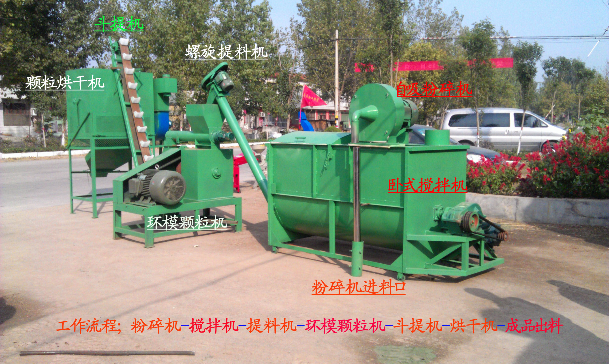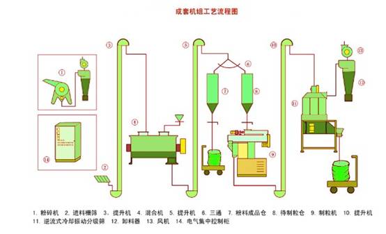 工藝流程為;粉碎機(jī)→攪拌機(jī)→提料機(jī)→顆粒機(jī)→提料機(jī)→干燥冷卻機(jī)
