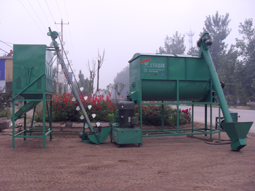工藝流程為;粉碎機(jī)→攪拌機(jī)→提料機(jī)→儲(chǔ)料倉(cāng)→喂料調(diào)質(zhì)機(jī)→顆粒機(jī)→提料機(jī)→干燥冷卻機(jī)→裝包機(jī)