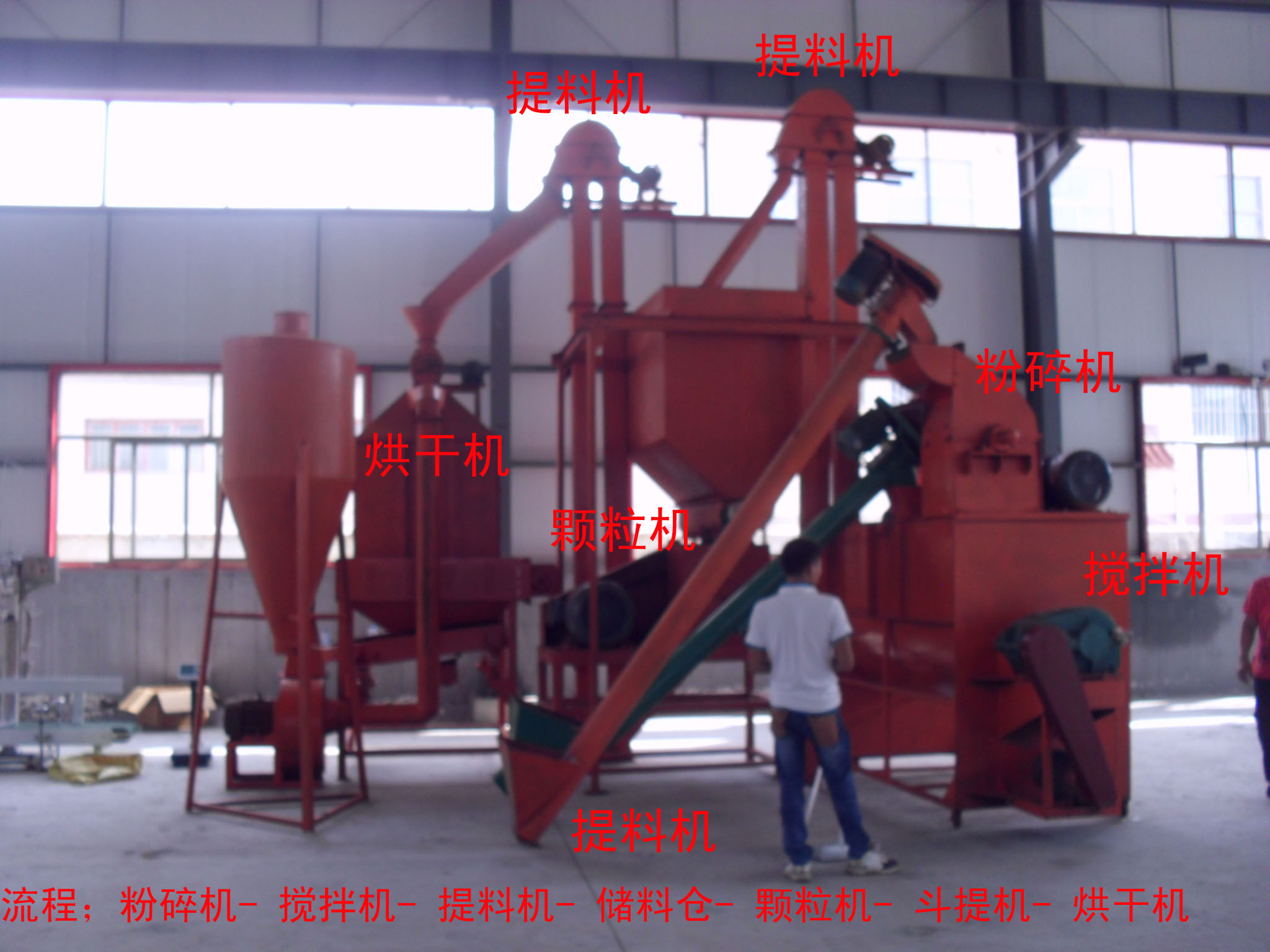 工藝流程為;粉碎機(jī)→攪拌機(jī)→提料機(jī)→儲(chǔ)料倉(cāng)→喂料調(diào)質(zhì)機(jī)→顆粒機(jī)→提料機(jī)→干燥冷卻機(jī)→裝包機(jī)